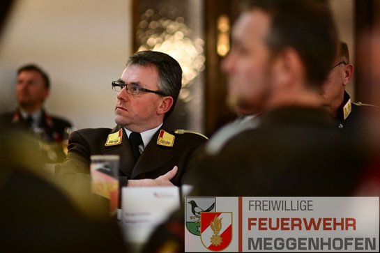 Der Saal im GH Auzinger war mit Mitgliedern und Ehrengästen gut gefüllt. Kommandant HBI Reinhard Voithofer konnte neben Bürgermeister Ing. Heinz Oberndorfer, Vize-Bgm. Josef Kaser, der ALin Irene Berger, auch den neuen Bezirksfeuerwehrkommandanten OBR Herbert Ablinger und den wiedergewählten Abschnittsfeuerwehrkommandanten BR Johann Kronsteiner begrüßen. Seitens anderer Blaulichtorganisationen waren von den Autobahnpolizeiinspektionen Gerhard Fellner (Ried) und Christian Bachl (Wels), sowie von der Polizeiinspektion Haag am Hausruck Gerold Brenneis anwesend. Auch die beiden weiteren Meggenhofner Feuerwehren Roitham und Wilhelmsberg durften mit einer Abordnung nicht fehlen. Laufend unterstütz werden die Feuerwehren der Gemeinde Meggenhofen von der örtlichen Raiffeisenbank. Daher konnten hier der Obmann DI Dr. Helmut Berger und der GF Manfred Falzberger, MBA begrüßt werden. Quasi just in time bringt die Fa. Autohaus FORD Danner Fahrzeuge für Übungen wenn sie benötigt werden. Hier wurde sich bei den Anwesenden Abschleppfahrern Christian Weinhäupl und Martin Spannlang besonders bedankt.