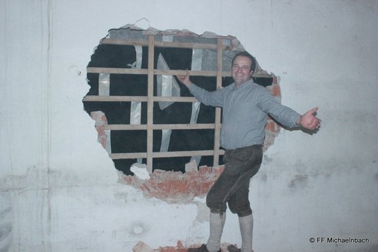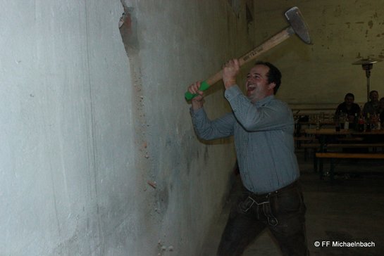 Bei der Abrissparty wurde auch gleich ein erster Arbeitsplan für den Rohbau, der 12 Urlaubswochen erfordert, eingeteilt. Das bei allen die Freude über einen beginnenden Neubau groß ist und jeder mit dem Herzen bei der Sache ist, zeigen die nachfolgenden Bilder, wo in der Feierlaune ein herzförmiges Abrissloch entstanden ist.