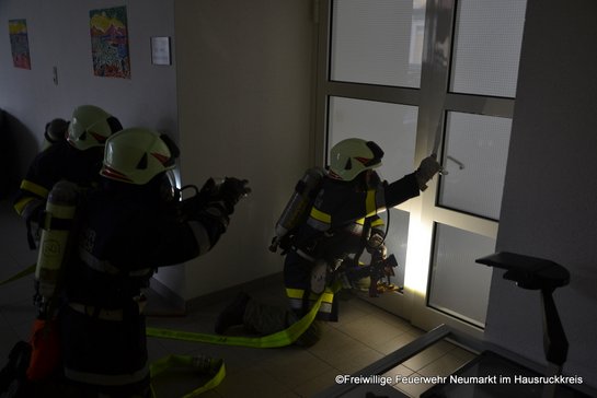 Als Übungsannahme wurde ein Küchenbrand im Schulzentrum Neumarkt i.H. dargestellt. Zehn Kinder sowie ein Hausmeister wurden vermisst.
