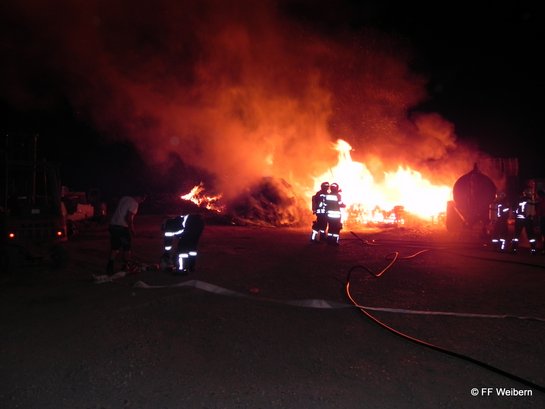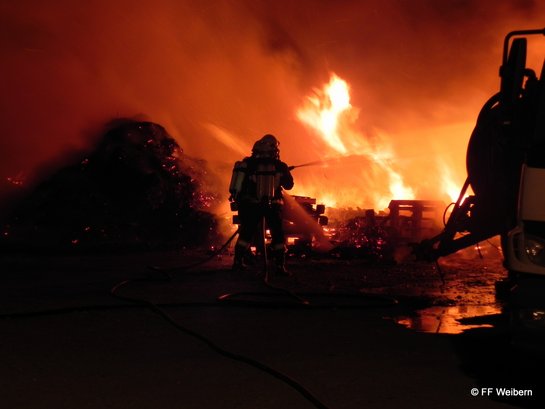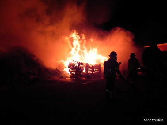 Ein Passant entdeckte die Flammen und alarmierte die Einsatzkräfte und den Hausbesitzer. Bereits während der Anfahrt wurde von Einsatzleiter HBI Georg Stockinger auf Grund des weithin sichtbaren Feuerscheins und der besonderen Gefährdung des Objektes Alarmstufe 2 ausgelöst. Größere Mengen an Strauchschnitt, Einwegpalletten und Holzstöcke sind aus bisher unbekannter Ursache in Brand geraten. Durch einen massiven Löschangriff der acht eingesetzten Feuerwehren konnte der Brand rasch eingedämmt werden. Mehrere abgestellte LKW´s und Anhänger sowie das angrenzende Betriebsgebäude konnten gerettet werden. Mit Hilfe eines Radladers wurde das gesamte Material umgeschichtet und restlos abgelöscht. Im Einsatz standen: FF Aistersheim, FF Gaspoltshofen, FF Geboltskirchen, FF Grieskirchen, FF Haag/H., FF Rottenbach, FF Ruhringsdorf und FF Weibern (bis 04:38 Uhr)