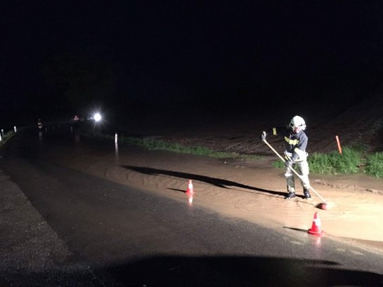 Vor Ort ergab sich folgendes Bild: Der Straßengraben konnte die Wassermassen nicht mehr bewältigen da das Abflussrohr mit Erdreich zugeschwemmt wurde. Daraufhin stand ein Teil der L520 vollständig unter Wasser. Mithilfe zweier Traktoren und Kippschaufeln wurde versucht, den Graben wieder frei zu machen. Um 22:43 Uhr konnte der Einsatz beendet werden. Im Einsatz standen: FF Affnang mit 16 Mann sowie die Straßenmeisterei Weibern. Bericht und Fotos: AW Peter Ögger, FF Affnang