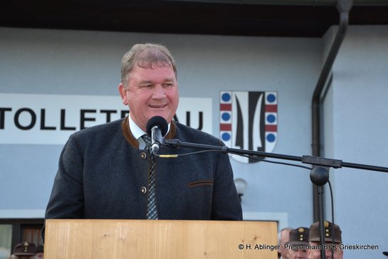 Kommandant Thomas Wieser begrüßte am Freitagabend 28 Gastfeuerwehren mit 373 KameradInnen zum Festakt vor dem Feuerwehrhaus der FF Tolleterau (Gemeinde St. Georgen bei Grieskirchen) sowie viele Ehrengäste aus Politik, Wirtschaft und Blaulichtorganisationen. Die weitest angereiste Feuerwehr kam aus der Gemeinde Putzleinsdorf, die FF Ollerndorf. St. Georgners Pfarrer Pater Herbert segnete nach den Festansprachen des Kommandant Wieser, des Bürgermeister Furthmair, des Landes-Feuerwehrkommandant Kronsteiner, des Bundesrat Oberlehner und des 2. Landtagspräsident Adalbert Cramer das neue Einsatzfahrzeug: Ein RLFA 2000 (Rüst-Lösch-Fahrzeug mit Allrad und 2000 Liter Löschwasser), das bereits am 7. Dezember 2016 an die Feuerwehr ausgeliefert wurde (wir berichteten).
