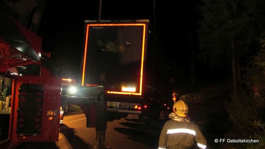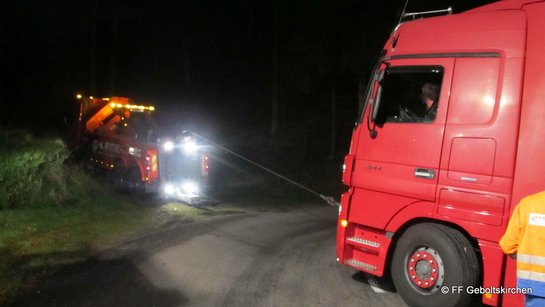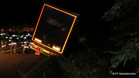 Vermutlich um den kilometerlangen Staus auf der Innkreisautobahn zu entgehen, wurde ein rumänischer LKW-Lenker vom Navi über die L1074 von Geboltskirchen nach Eberschwang gelotst. In einer Spitzkehre geriet der Auflieger auf Bankett, rutschte anschließend in den Straßengraben und drohte umzustürzen. In Abstimmung mit der Polizei und dem Spediteur wurde von der Feuerwehr ein Abschleppunternehmen vermittelt. Nachdem der LKW geborgen war, wurde noch die Straße gereinigt und schließlich gegen 3 Uhr morgens der Einsatz beendet.
