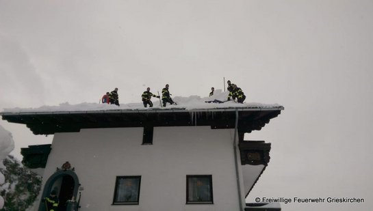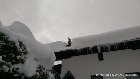 Hauptaufgabe lautet die unzähligen Dächer von den großen Schneemengen zu befreien. Dabei arbeiten 2 Mannschaften abwechselnd am Dach, um unter entsprechender Eigensicherung die Flächen abzuschaufeln. Mehrere Objekte konnten seit den frühen Morgenstunden bereits abgearbeitet werden.