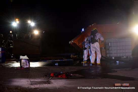Ein umgestürzter IBC-Container mit einem flüssigen Kunsstoff-Härter forderte Freitagabend die Einsatzkräfte von Neumarkt.