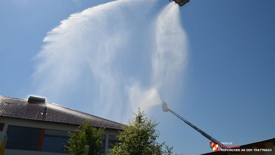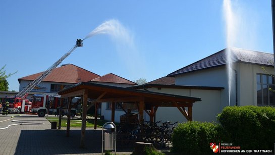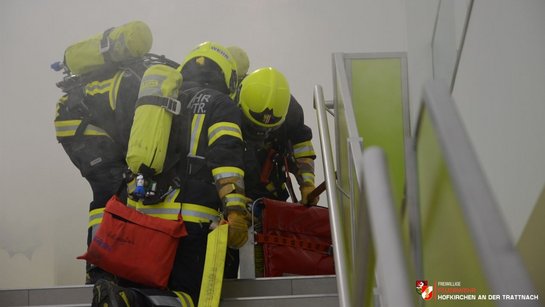 Übungsannahme war ein Brand im ersten Stock der MS Hofkirchen, wobei eine Klasse mit 16 Personen durch den Brandherd eingeschlossen war. Nach einer ersten Erkundung wurde ein Atemschutztrupp zum Erstangriff abgestellt, während die restliche Mannschaft die Löschwasserversorgung sicherstellte. Kurz darauf trafen bereits die ersten nachalarmierten Feuerwehren ein.
