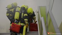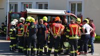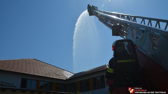 Über die Drehleiter konnten die eingeschlossenen Kinder samt Lehrperson rasch gerettet werden. Im Zuge der Rettungsaktion wurde dann noch ein Atemschutznotfall simuliert, der verletzte Atemschutzträger wurde durch einen Rettungstrupp in Sicherheit gebracht.