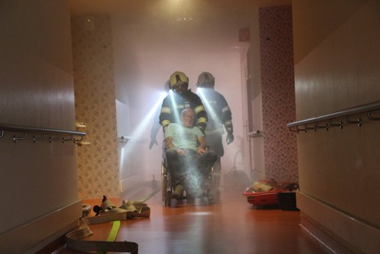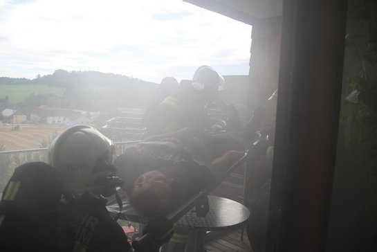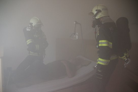 Während die Menschenrettung durch die Atemschutztrupps begann wurde zeitgleich von der Innbachsaugstelle beim Freibad eine 640 Meter lange Zubringerleitung errichtet, um die Wasserversorgung für eine umfassende Brandbekämpfung und den Schutz der anderen Bauteile sicherzustellen. Die 19 Statisten, unter denen sich auch interessierte Heimbewohner*innen befanden, wurden durch die Atemschutztrupps in angrenzende, rauchfreie Brandabschnitte gebracht und durch weitere Einsatzkräfte über ein Fluchtstiegenhaus ins Freie getragen. Dort wurden sie am nahe gelegenen Sammelplatz von den teilnehmenden Rot-Kreuz-Mitarbeiter*innen registriert und versorgt.