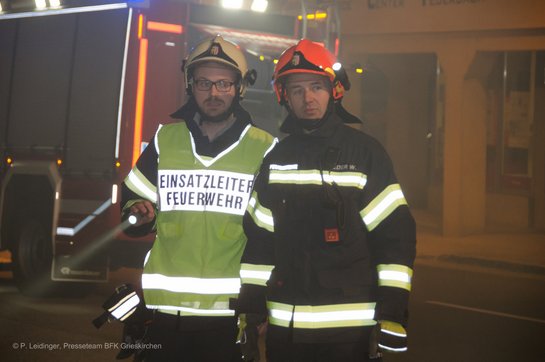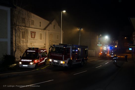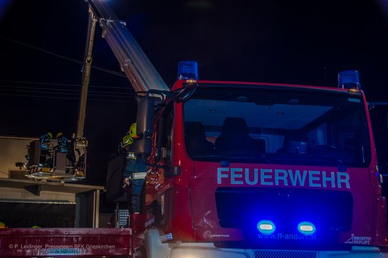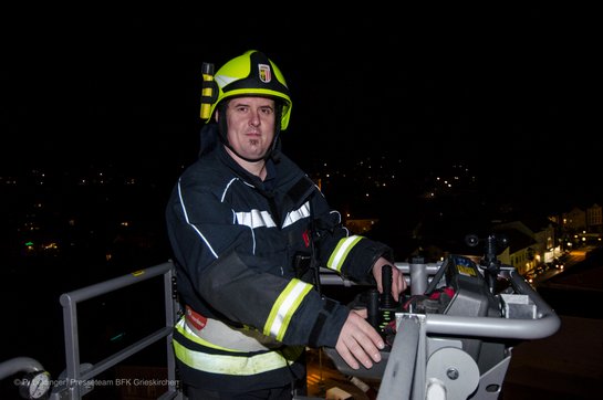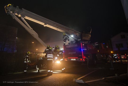 Übungsannahme war ein Brandausbruch in der Selchkammer, welcher sich aber rasch auf das gesamte Gebäude ausbreitete. Aufgrund der starken Rauchentwicklung, welche bereits bei der Anfahrt zu sehen war, wurden zur weiteren Unterstützung die FF Untertreßleinsbach mit dem Löschfahrzeug und die FF Andorf mit ihrer Teleskopmastbühne angefordert. Nach der ersten Lageerkundung durch den Einsatzleiter BI Bernd Manigatterer wurde festgestellt, dass sich noch vier Personen in dem brennenden Gebäude befinden. Aus diesem Grund wurden sofort drei Atemschutztrupps zur Menschenrettung und Brandbekämpfung in das Gebäude geschickt. Um eine ausreichende Wasserversorgung sicher zu stellen, wurde eine Zubringerleitung vom naheliegenden Hydranten aufgebaut. Bereits nach kurzer Zeit konnten die vermissten Personen gefunden werden und über das Dach mithilfe der Teleskopmastbühne gerettet werden. Auch das Feuer schien schon unter Kontrolle zu sein, doch nicht vollständig gelöschte Glutnester entzündeten sich erneut. Dies machte den Einsatz eines vierten Atemschutztrupps notwendig. Eine große Herausforderung war auch, die am Abend stark befahrene Bundesstraße mit einer unübersichtlichen Kurve beim Übungsobjekt, wechselweise für den Verkehr zu sperren. Nach rund einer Stunde konnte schließlich „Brand aus“ gegeben werden und die Übung mit positivem Resümee abgeschlossen werden. Für die Feuerwehr Andorf war es die erste Teilnahme an einer Übung im Bezirk Grieskirchen mit ihrer neuen Teleskopmastbühne. Diese hat sich aber sehr gut unter Beweis gestellt, da sie auch im Ernstfall in der Lage sind rasch Hilfe leisten zu können. Auch Abschnitts-Feuerwehrkommandant BR Helmut Neuweg machte sich ein Bild von der Übung und konnte bei der anschließenden Nachbesprechung nur positive Worte finden. Ein Dank gilt neben den beiden teilnehmenden Feuerwehren vor allem Herrn Martin Linder von fairsichert für die Zurverfügungstellung des Übungsobjekts.