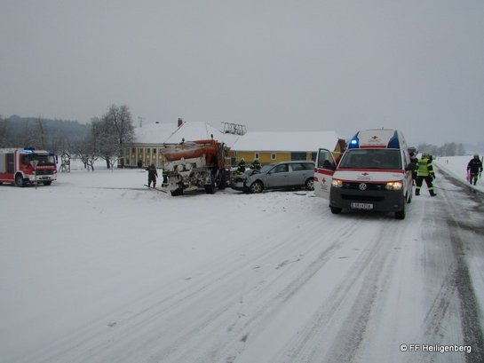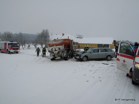 Ein PKW ist im Kreuzungsbereich Au/Oberleiten mit einem Räumfahrzeug kollidiert. Bis zur Ankunft auf der Unfallstelle konnten sich die beteiligten Personen bereits selbstständig aus ihren Fahrzeugen befreien. Zwei der verunfallten Personen wurden durch die Rettung mit Verletzungen unbestimmten Grades ins Krankenhaus eingeliefert. Die FF Heiligenberg richtete eine örtliche Umleitung ein. Durch die schwere Beschädigung des Tankes des Räumfahrzeuges wurden die ausgeflossenen Betriebsmitteln gebunden und fachmännisch entsorgt.