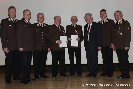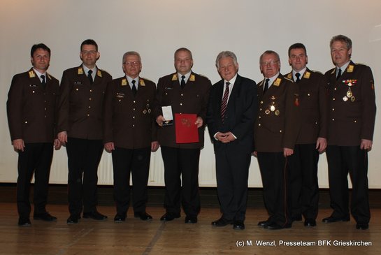 Nach dem Referat vom Landes-Feuerwehrkommandanten Dr. Wolfgang Kronsteiner, über das neue Oö. Feuerwehrgesetz, gab es für den amtierenden Bezirks-Feuerwehrkommandanten Josef Murauer eine Überraschung: OBR Murauer erhielt für seine bisherige Tätigkeit das Bundes-Verdienstabzeichen 2. Stufe verliehen. Neben den geehrten Bewerbsgruppen, die 2014 als Bezirkssieger hervorgingen, erhielten folgende Einsatzkräfte eine hohe Auszeichnung: