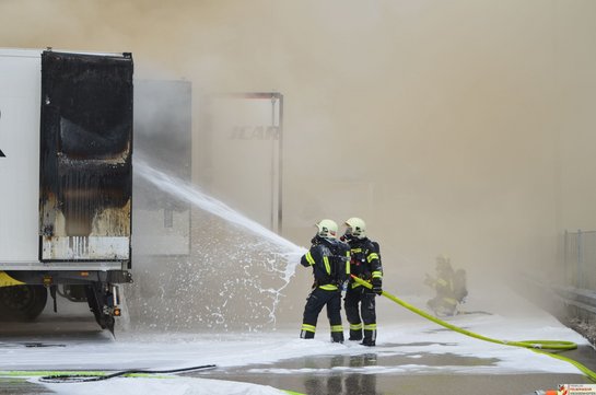 Das Ablöschen der ebenfalls in Brand geratenen Kühlauflieger stellte sich doch etwas schwieriger dar. Schon das Öffnen der Seitenwände war nicht so einfach. Mittels diverser Schneidgeräte konnten schließlich Löcher in die Wände geschnitten und Löschwasser eingebracht werden. Auch ein neuentwickeltes Löschgerät Drill-X (Bohrlöschlanze) kam zum Einsatz.