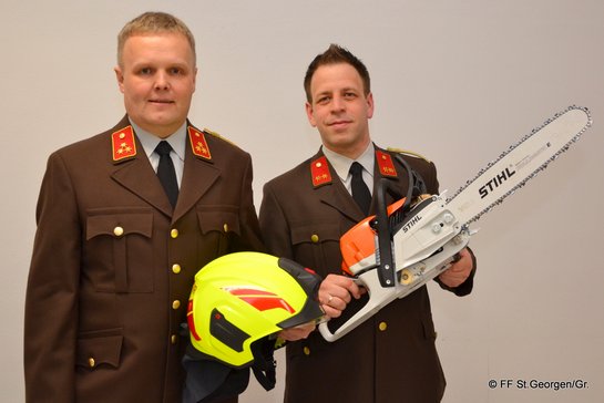 …zur Jugendhelferin: Anna Gaubinger Nach der Neuwahl des Kommandos übergab Bürgermeister Karl Furthmair die Führung an HBI Ablinger und überraschte ihn mit einem neuen Feuerwehrhelm. Kommandant Herbert Ablinger bedankte sich für den großen Vertrauensvorschuss und die familiäre Kameradschaft in der Feuerwehr. Das erweiterte Kommando wurde von Ablinger sofort mit Bescheid und Urkunde bestellt. Die drei ausgeschiedenen Funktionäre erhielten für ihre 15-jährige Tätigkeit den jeweiligen Ehrendienstgrad überreicht. Mit der Wahl zum Kommandanten legte Herbert Ablinger nach sechs Jahren als HAW für Presse- und Öffentlichkeitsarbeit seine Funktion im Bezirks-Feuerwehrkommando Grieskirchen zurück. Neues Gerät zum Einstand Da die Feuerwehr bis Dato keine eigene Motorsäge hatte, organisierte der neue Kommandant bis zur Vollversammlung ein neues Gerät. Drei private Sponsoren stellten sich mit dieser wertvollen Geräte-Spende beim neuen Kommando ein. Gerade in Zeiten von immer häufiger werdenden Sturmböen wird diese Spende ihre gute und häufige Verwendung im Feuerwehrdienst finden. Abschließend gab Ablinger einen Ausblick auf das bevorstehende Jubiläumsjahr und auf einige neue Herausforderungen in der Wehr. Das neue Kommando wird am ersten März-Wochenende auf eine zwei Tages-Klausur gehen um sich auf die bevorstehende Periode entsprechend vorzubereiten. Bericht und Fotos: FF St. Georgen bei Grieskirchen