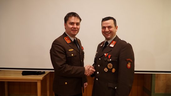 Bezirksfeuerwehrkommandant Josef Murauer und Bürgermeister Wolfgang Degeneve. Im Anschluss an die Ansprachen fand die Neuwahl des Kommandos statt, die Funktionäre wurden von 53 anwesenden Wahlberechtigten gewählt.