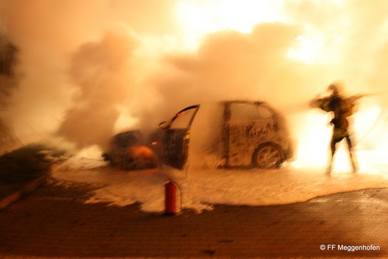 Ein am Parkplatz abgestellter PKW stand aus ungeklärter Ursache in Vollbrand. Der Lenker, sehr aufgebracht, neben seinem Fahrzeug. Unverzüglich wurde von beiden Feuerwehren ein Löschangriff mittels Mittelschaum gestartet, der sofort Wirkung zeigte.