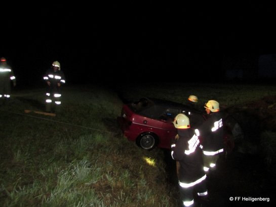 Verletzungen unbestimmten Grades erlitt am 23. Oktober 2015 ein 31-jähriger Autofahrer aus Eferding, nachdem er mit seinem Auto verunfallte. Der Mann fuhr mit seinem Pkw gegen 19:10 Uhr auf der Schaunberger Landesstraße (L1214) Richtung Waizenkirchen. Im Gemeindegebiet von Heiligenberg kam er bei einer Rechtskurve von der Straße ab, schlitterte rund 70 Meter in der Wiese entlang und schlug mit seinem Fahrzeug im Bachbett des Sandbaches ein. Der Verunfallte war an der Unfallstelle ansprechbar. Ein durchgeführter Alkovortest verlief positiv. Nach der Erstversorgung wurde er mit der Rettung in das Klinikum Wels eingeliefert. Am Fahrzeug entstand Totalschaden. Die FF Heiligenberg war mit zwei Fahrzeugen und 20 Mann im Einsatz.