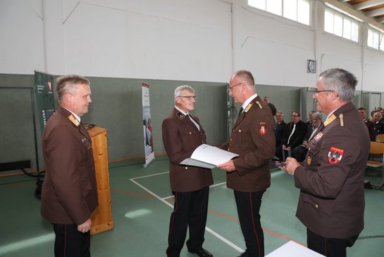 Nach der Laudatio durch Bezirks-Feuerwehrkommandant OBR Herbert Ablinger, überreichte Landesbranddirektor-Stellvertreter Michael Hutterer die Auszeichnung. Umrahmt wurde der Festakt, dem neben Feuerwehrmitgliedern aus Österreich auch Abordnungen des Öst. Bundesheeres, des Roten Kreuzes und der Polizei beiwohnten, von einer Abordnung der Militärmusik Salzburg.