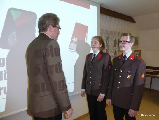 Die von der Jugend in den Aktivstand übergetretenen Jungfeuerwehrmitglieder Gina Heusinger und Thomas Kronsteiner wurden von Kommandant Herbert Kronlachner angelobt.
