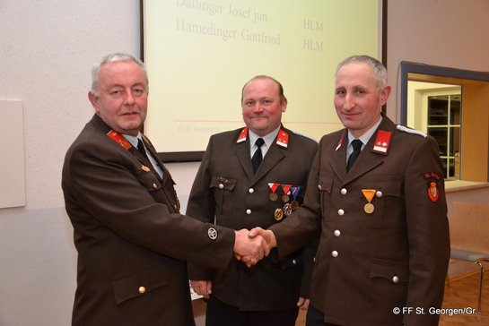 Im Ausnahmejahr 2016 wird es somit erstmals eine Kinderfeuerwehr geben, die auf lustige und spielerische Art als Gruppe mit unter 10-jährigen Kindern geführt wird. Als Dank für seine 10-jährige Jugendbetreuertätigkeit wurde Brandinspektor Alexander Doppelbauer von der Jugendgruppe mit einem Geschenk überrascht. Kommandant Fuchshuber bedankte sich bei der Gemeinde für die Finanzierung und Errichtung eines Löschbehälters in Steindlberg und für den Ankauf von acht blauen Einsatzhosen für die Atemschutzträger. Weiters wurden 30 paar technische Einsatzhandschuhe durch die Gemeinde St. Georgen mitfinanziert. Da es 2015 einen Übertritt von der Feuerwehrjugend in den Aktivstand gab, konnte Anna Gaubinger an diesem Abend ihr Gelöbnis ablegen. Zum Hauptlöschmeister (HLM) wurden Josef Dallinger jun. und Gottfried Hamedinger befördert. Für seine 25-jährige Mitgliedschaft wurde der Schriftführer Robert Dallinger geehrt. Abschnitts-Feuerwehrkommandant Brandrat Johann Kronsteiner überraschte den Kommandanten Norbert Fuchshuber mit einer Auszeichnung: Fuchshuber wurde für seine bisherigen Verdienste um das Feuerwehrwesen mit der Bezirks-Verdienstmedaille in GOLD ausgezeichnet. Nach den Festansprachen von Brandrat Kronsteiner und Bürgermeister Furthmair schloss Kommandant Fuchshuber die 128. Versammlung mit den Worten "Gott zur Ehr, dem nächsten zur Wehr". Bericht und Fotos: HAW Herbert Ablinger, FF St. Georgen bei Grieskirchen