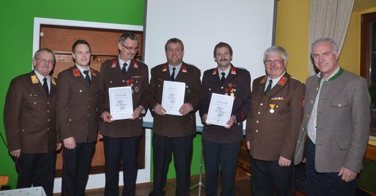 Aufgrund des trockenen Sommers und der damit verbundenen Wasserknappheit wurden 85 Wasserversorgungen mit dem neuen Tanklöschfahrzeug durchgeführt. Zu 12 Einsätzen auf Verkehrswegen wurde gerufen. Das Entfernen von Wespennestern in nahen Wohnbereichen war oft notwendig. Die Ausbildung, die laufende Schulung und Übung war mit mehr als 60 Tätigkeiten in diesem Bereich ein wichtiger Schwerpunkt in der Feuerwehrarbeit. Der Natternbacher Wehr gehören aktuell 83 Feuerwehrmänner an. Erfreulich ist der Neueintritt von vier aktiven Kameraden und zwei Kameraden in der Jugendfeuerwehr. In der Jugendgruppe wird hervorragende Nachwuchsarbeit geleistet. Die Jungfeuermänner nahmen an den Leistungsbewerben, am Jugendlager und erstmalig am neuen Jugendcup erfolgreich teil. Abschnitts-Feuerwehrkommandant Brandrat Helmut Neuweg informierte über Neuigkeiten aus dem Feuerwehrwesen und neue Aufgaben im Jahr 2016. Bürgermeister Josef Ruschak bedankte sich für die geleisteten Tätigkeiten und die gute Zusammenarbeit mit der Marktgemeinde. Gemeinsam mit Abschnittskommandant Neuweg und Kommdant Gumpinger nahm er die Ehrung und Auszeichnung verdienter Feuerwehrkameraden vor. Mit Verdienstzeichen bzw. Ehrenurkunden wurden ausgezeichnet: