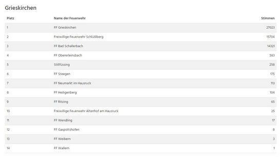 Tips, der ORF OÖ, das Land OÖ, die Sparkasse OÖ und Zipfer suchen die sympathischste Feuerwehr Oberösterreichs. Gewählt werden konnte jede Feuerwehr des Landes. Aus dem Bezirk Grieskirchen standen 14 Feuerwehren zur Wahl, daraus ergaben sich folgende Sieger: