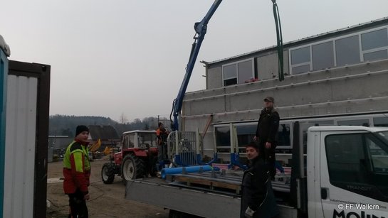 Einige Kameraden der FF Wallern montierten auch bereits Teile der Haupttreppe ins erste Obergeschoß. Mit vereinten Kräften gelang es, die 500 kg schweren Stiegenelemente in ihre Position zu bringen und zu fixieren.