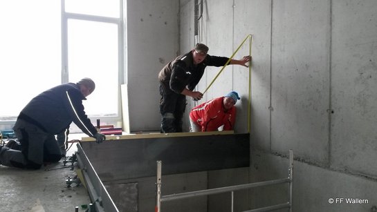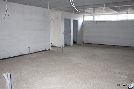 Auch der Innenausbau geht sehr schnell voran. So konnte bereits Ende Februar die Schüttung im Bereich der Umkleide-, Bereitschafts-, Kommando- und Schulungsräume fertiggestellt werden. Die gesamten Installationen (Kabel, Leitungen, u.dgl.) wurden bereits im Vorhinein sorgfältig verlegt. Auch in der Fahrzeughalle befindet sich bereits der fertige Boden, welcher ein besonderes Highlight mit sich bringt. Im Bereich der Stellplätze wurden von den Kameraden der FF Wallern die Fahrtrinnen installiert, welche dafür sorgen, dass das Wasser von den Autos sich nicht in der Fahrzeughalle verteilt, sondern unter flächenbündigen Lochgummimatten abfließt.