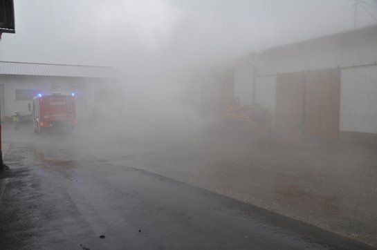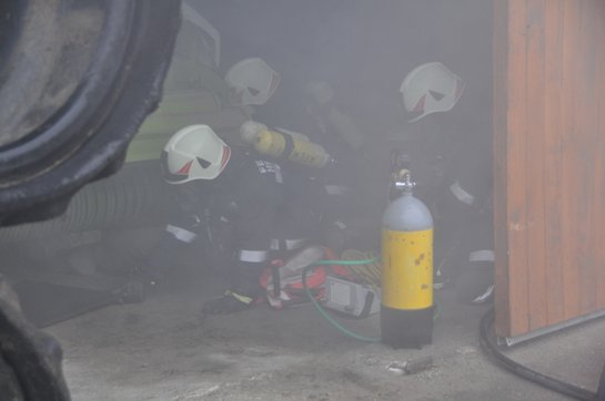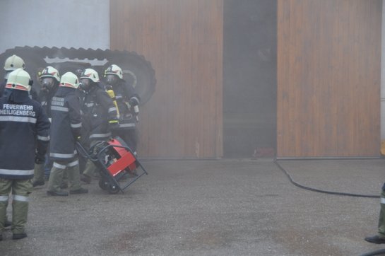 Übungsannahme war eine starke Rauchentwicklung in einer Halle, in der noch eine Person vermisst wurde. Unter der Einsatzleitung von HLM Michael Achleitner wurde schon bei der Anfahrt der Befehl zum Vorbereiten des Atemschutztrupps gegeben. Mittels HD-Rohr wurden die Atemschutzträger zum Innenangriff in die verrauchte Halle geschickt, um die Person zu suchen. Diese wurde rasch, jedoch unter dem Vorsatz eines Feldhäckslers eingeklemmt, gefunden. Mittels Hebekissen und Unterlegholz wurde der Vorsatz angehoben und der Verletzte sicher aus dem Gefahrenbereich gebracht. Zeitgleich wurde zur leichteren Rettung des Verletzten die Maschinenhalle mit dem Hochleistungslüfter rauchfrei gemacht.