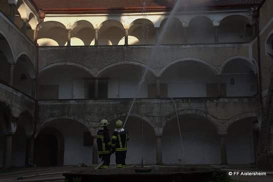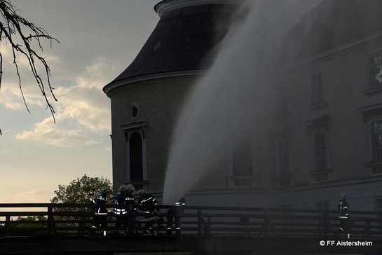 Zu der diesjährigen Großübung konnte Kommandant Roman Schwarzgruber alle Feuerwehren der Alarmstufe 2 von der FF Aistersheim begrüßen. Übungsannahme war ein Großbrand im Ostteil des Wasserschlosses Aistersheim. Der Dachstuhl brannte fast lichterloh und es gab Hinweise von mehreren vermisste Personen. Das einzige was nicht fehlte war genug Wasser.